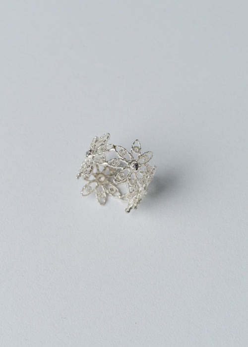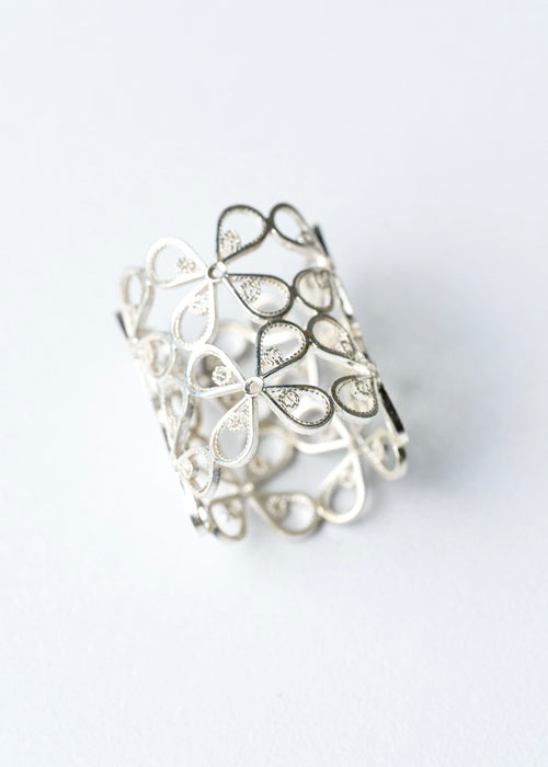Anillo en plata 970 en forma de flor, compuesto por varios espirales que se abren hacia afuera de manera simétrica. Cada “pétalo” está formado por dos flores en tejido filigrana en los extremos, unidas por un entramado central abierto con una pequeña piedra brillante, que funciona como punto focal de la pieza.